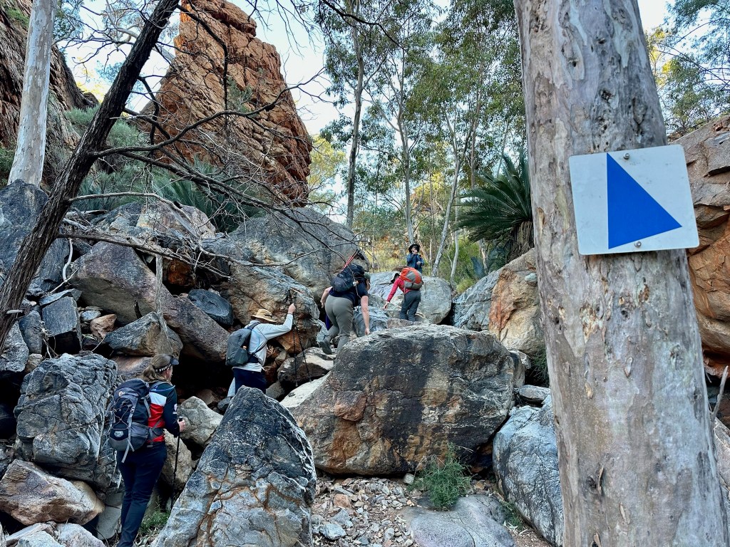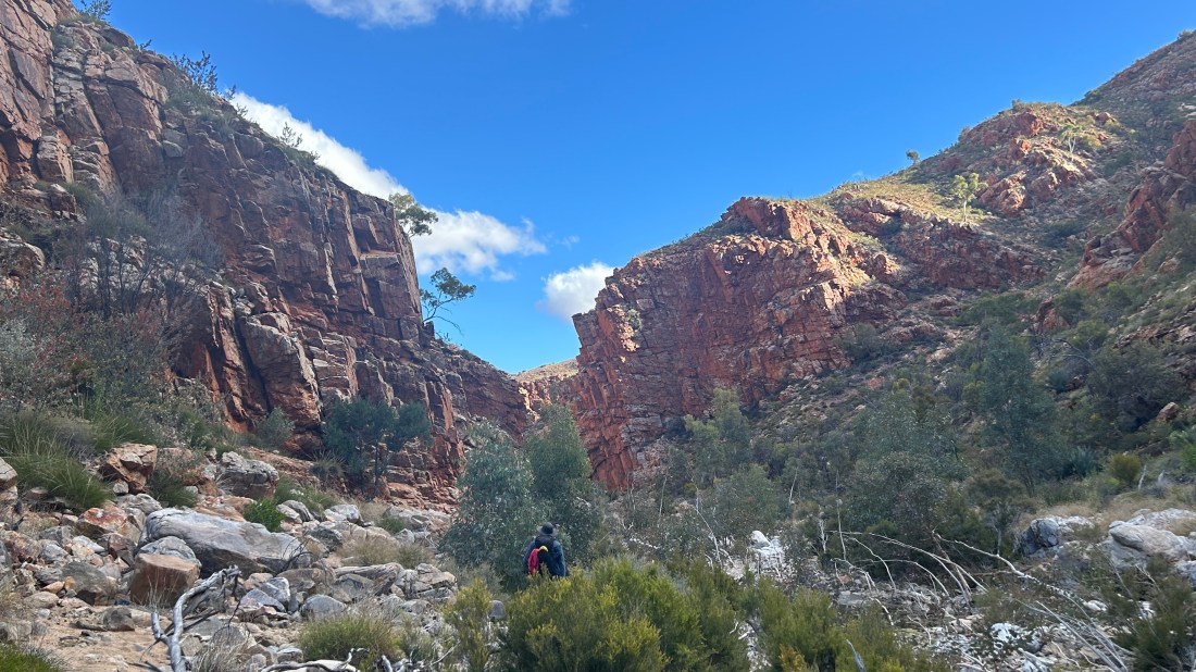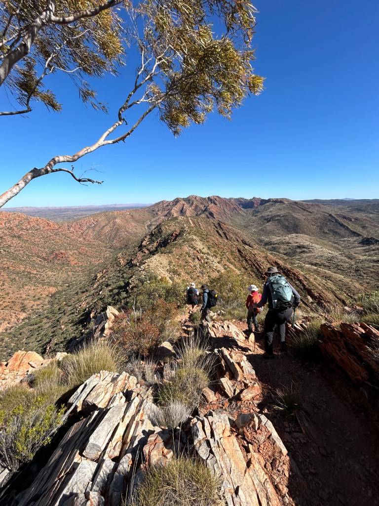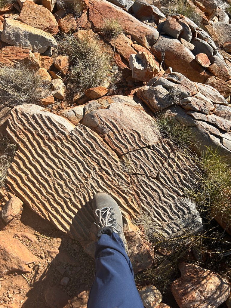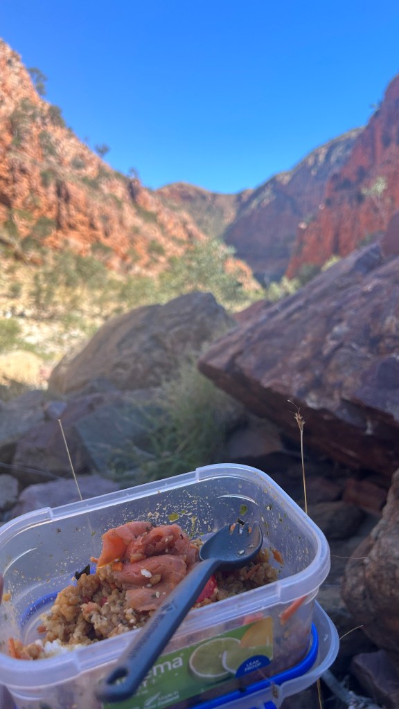 From the top, we walked along a ridge and then down a steep descent (I was very glad we were not climbing that!) with a howling gale into our faces. In the wind, we were lucky that the path was quite wide, unlike some of our other ridge walks. After the descent and about 8km into the day, we hit the flat – and this was true flat, not Larapinta flat! We had lunch around 12km in at a lovely shady spot by a river., then turned off the path at 16km to cut across to the campsite, across a wide creek. Thanks to Ollie, we managed to keep our feet dry!