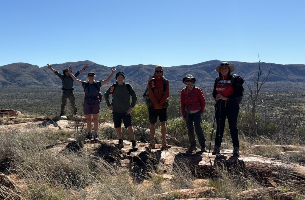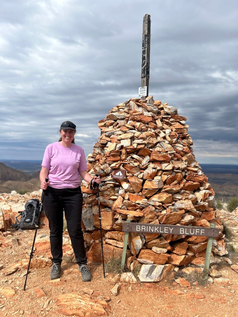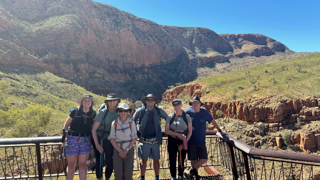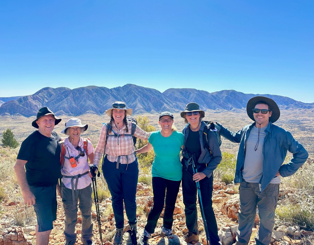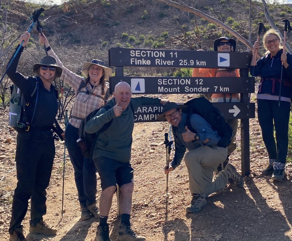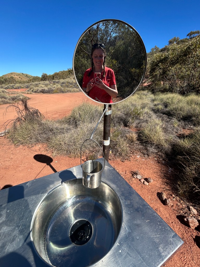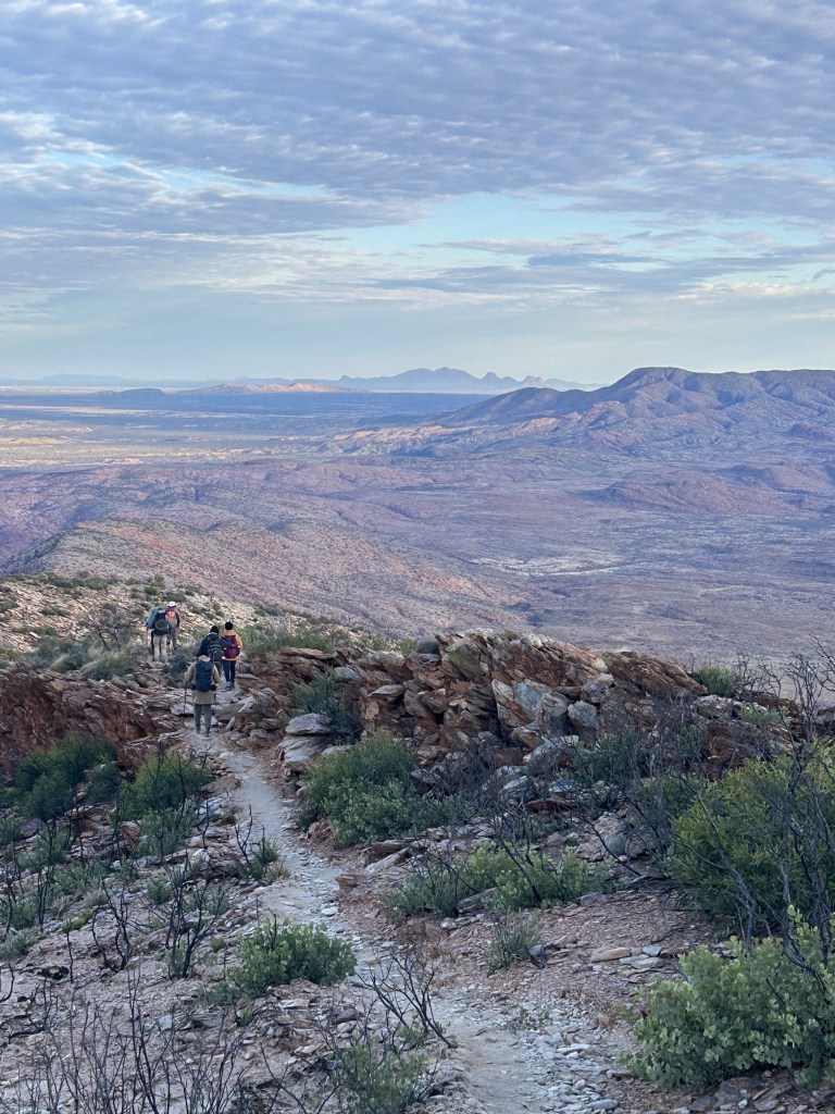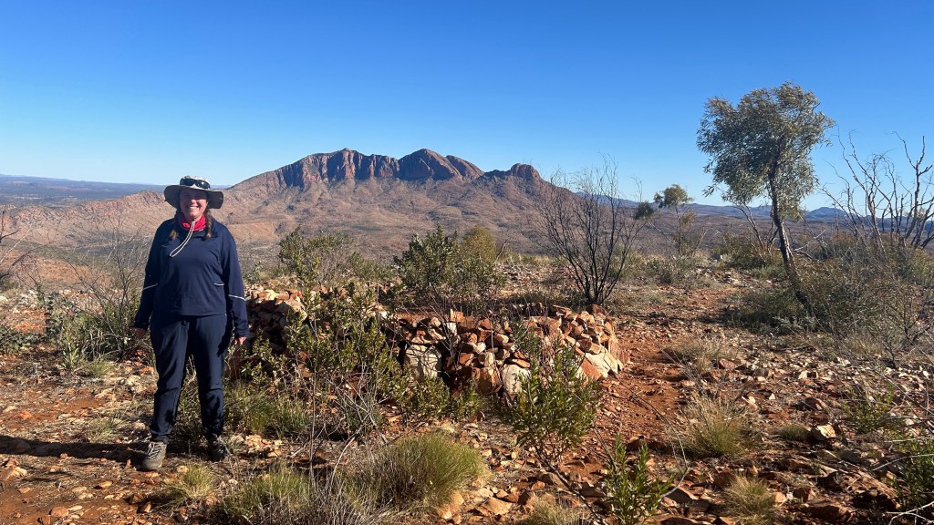 It had warmed up a fair bit by the time we started walking – I felt OK in a t-shirt and a thin long-sleeved top despite how cold it had felt a couple of hours earlier. We enjoyed 4km of “Larapinta flat” before hitting what we knew was the only climb of the day, but it was a fairly big one. It was my turn for the radio again meaning I took the lead and everyone else had to walk at my plod pace! There were amazing views of Mt Sonder throughout, especially at the top (originally named Hill Top Lookout) and we looked forward with some trepidation (keep reading to find out why the trepidation) to returning the next day. It was great to knock off the climb while it was still cool, but afterwards I switched to shorts – mostly because they were much, much cleaner than my trousers. I was very much getting to the stage of wearing what stank the least!