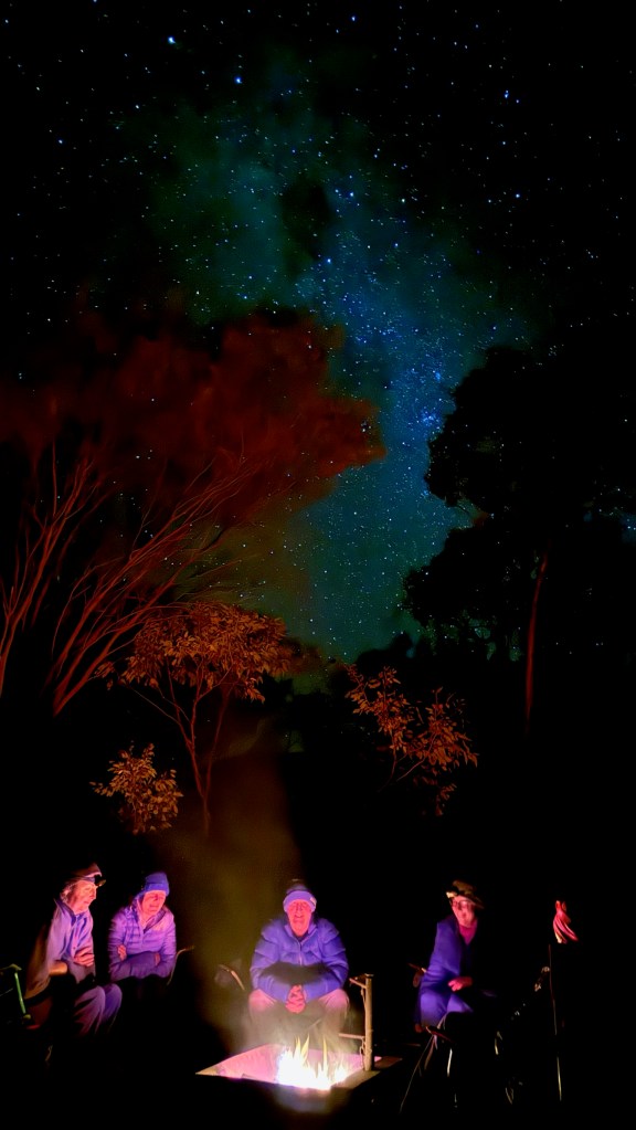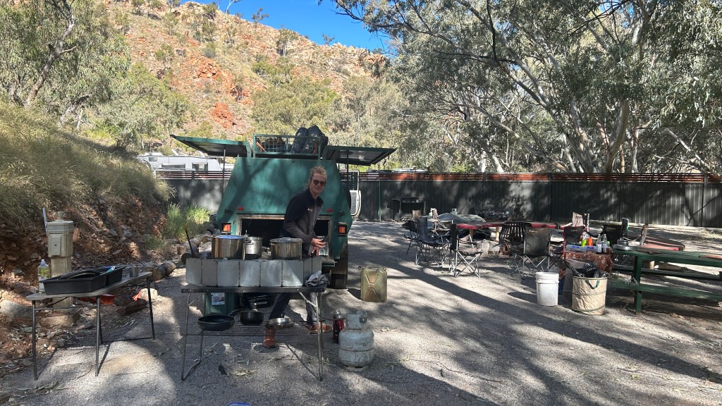 After packing, we enjoyed the entree of sun-dried tomato damper cooked in the camp oven, which was nothing short of spectacular, along with the last beer of the trip while looking at the sunset across the creek. It was weird to think I’d be in Alice Springs at the same time tomorrow, and I was sad at the idea of leaving this world behind. The main event of roast chicken and root veggies was just as good as the damper, and the addition of fruit salad made it a three course meal!