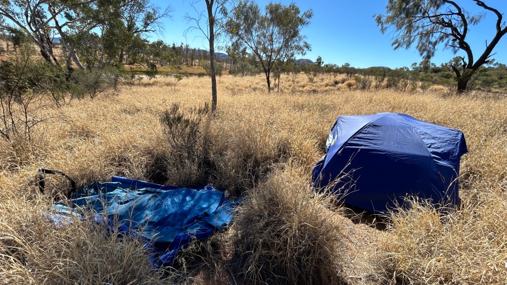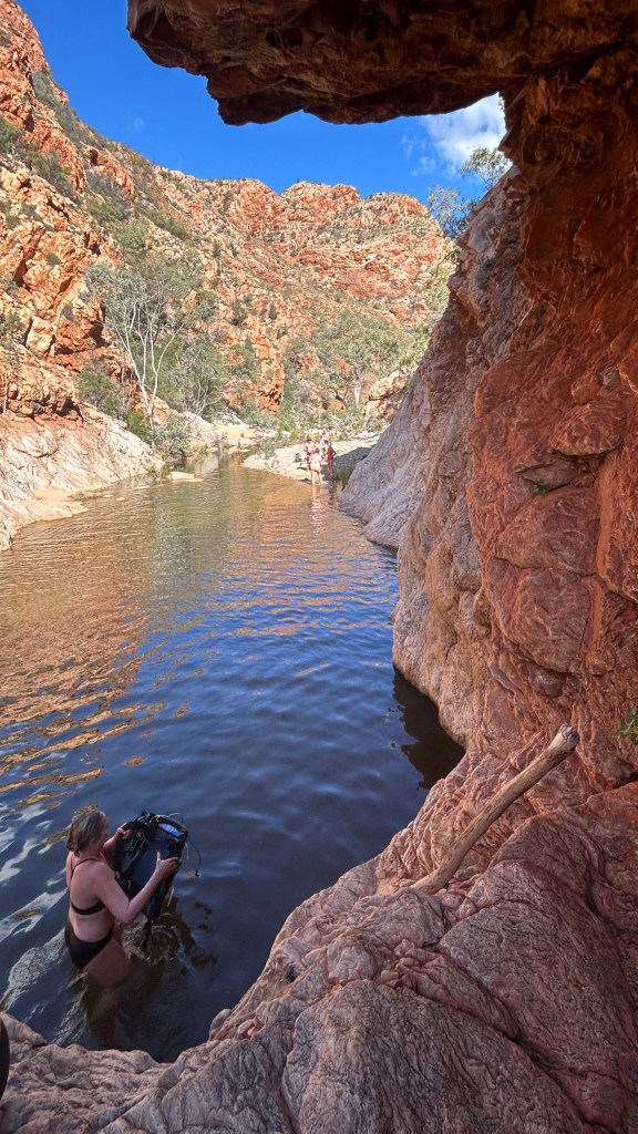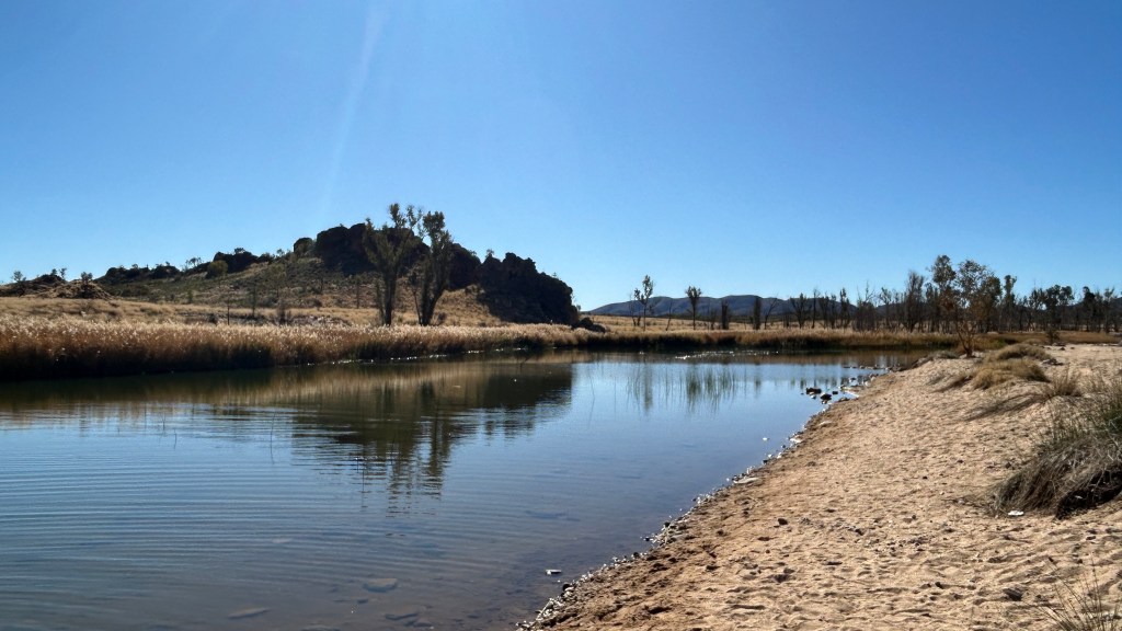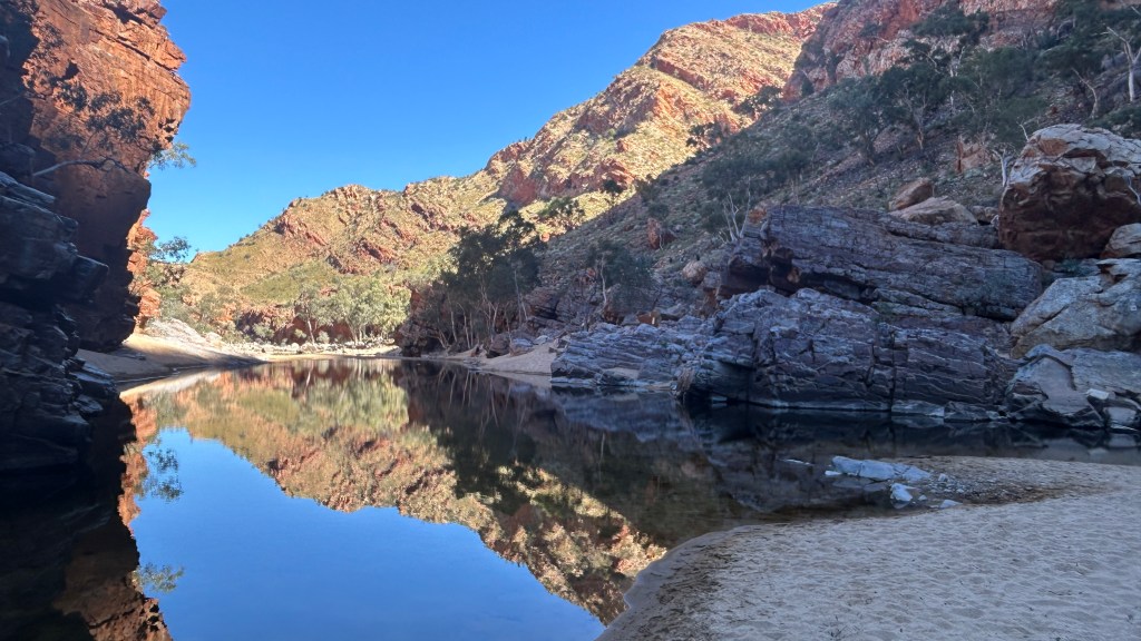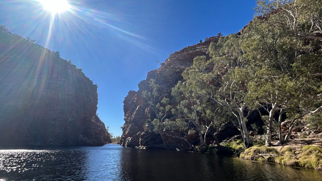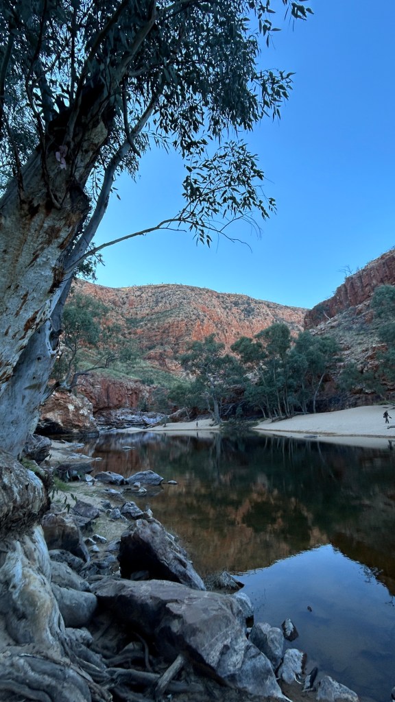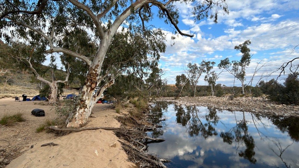 Once back in the car park, we bought coffee at the cafe (a PROPER FLAT WHITE!) and then enjoyed a wonderful swim in the gorge which was much warmer than Birthday and Ellery. Then back in the troopie and a 20 minute drive to our next and final camp at Finke River. There I found a lovely spot amongst the bufflegrass – just room for one swag and one tent, in my own little part of the site. It would do nicely as my home for the last two nights of the trip!