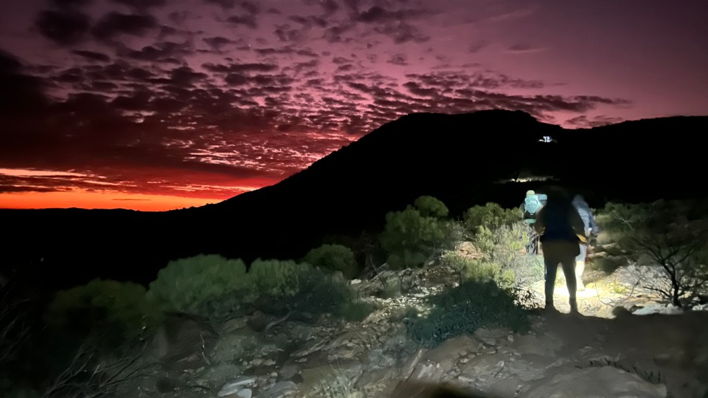 It was a half hour drive to Redbank Gorge, the base of the Sonder walk, from where we would walk up the western side. As instructed, we took layers off as we’d be going steeply uphill, and we started walking before 3.15am. All very surreal!