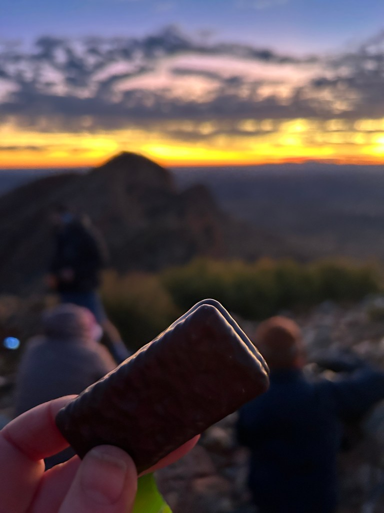 We reached the top (the “belly button” – the very top “breasts” of the pregnant lady are an indigenous sacred site) around 6.40am, 30 min before sunrise but the light was already fabulous. I put more clothes on, but it wasn’t nearly as cold as expected based on the previous couple of mornings. I enjoyed two cups of tea and a Tim tam dunked in each, while many photos were taken, and one of our group set up a time lapse on his phone which turned out brilliantly. It was fairly busy with other groups also around, but there were some fabulous views nonetheless and the other side of the mountain was lovely too.