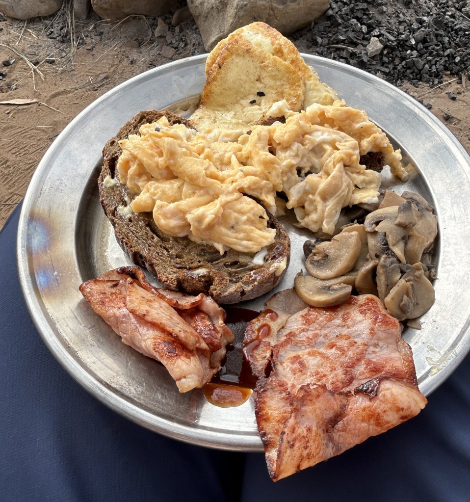 We had our final photo next to the sign at the bottom by the car park, then got into the troopie and back to camp, where Ollie was putting the finishing touches to brunch. And brunch was wonderful – scrambled egg, halloumi, mushrooms, bacon and toast. After that, packed up (oh god, everything stinks!) and got out of about 12.30.